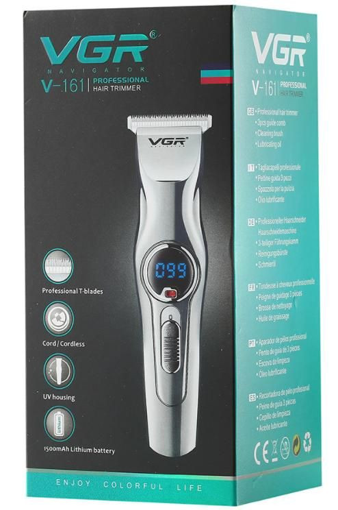 ماشین اصلاح موی سر و صورت و بدن وی جی ار مدل V-161 دارای سه سری مختلف است و برای کسانی که موهای صورت خود را با شمارهی صفر اصلاح میکنند مناسب خواهد بود. این محصول بدنهای با طراحی مطلوب دارد که دردستگرفتن و کار با آن را آسان کرده است. موتور این ماشین اصلاح هم کاملاً پرقدرت است. میتوانید با استفاده از 3 عدد شانهی موجود در بستهبندی این محصول، موهایی با طول 3، 1 و 9 میلیمتر داشته باشید. پس از پایان اصلاح میتوانید خردههای مو را از طریق برسی که داخل جعبه ارائه شده تمیز کنید. برای شارژ این ماشین 4 ساعت زمان لازم است که پس از آن قادر خواهید بود تا 180 دقیقه از این دستگاه استفاده کنید.این ماشین اصلاح توسط یک آداپتور ۵ ولتی با شدت جریان ۱ آمپر قابل شارژ است. همچنین نشانگر LED شارژ هم برای این محصول در نظر گرفته شده است که میزان شارژ این ماشین اصلاح را نشان میدهد