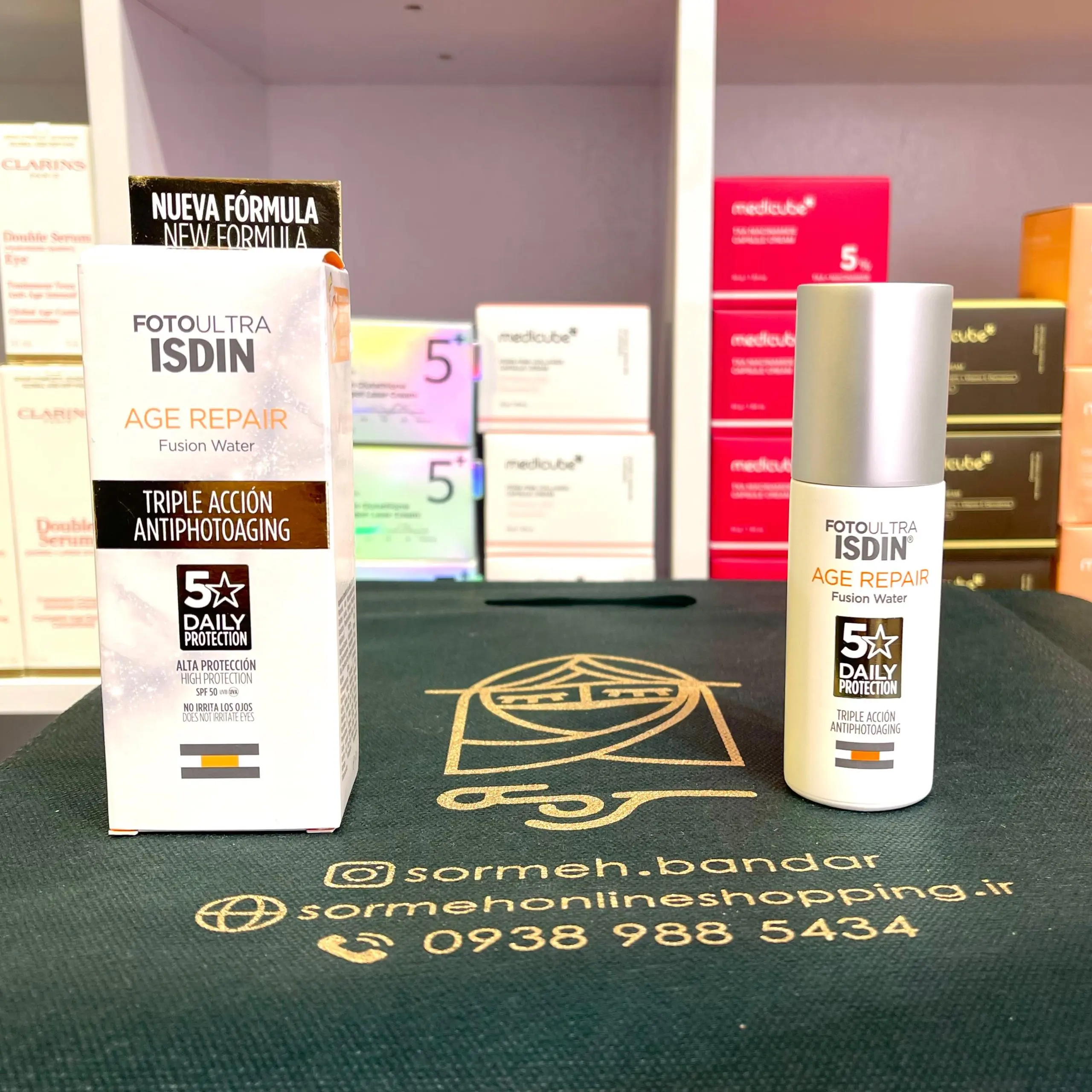 تفاوت ایج ریپر با فیوژن واتر معمولی چیست؟ فیوژن واتر معمولی فقط محافظت میکند، اما ایج ریپر (Age Repair) دارای ترکیبات جوانساز و ضد چروک است که به درمان علائم پیری پوست کمک میکند.